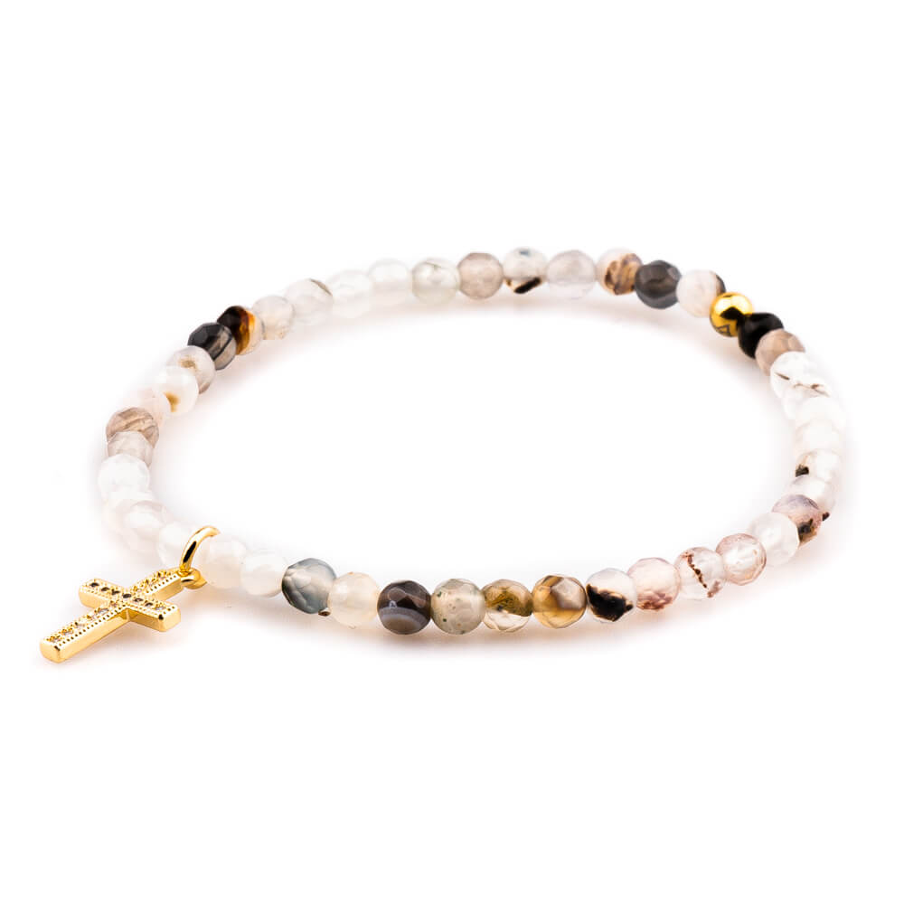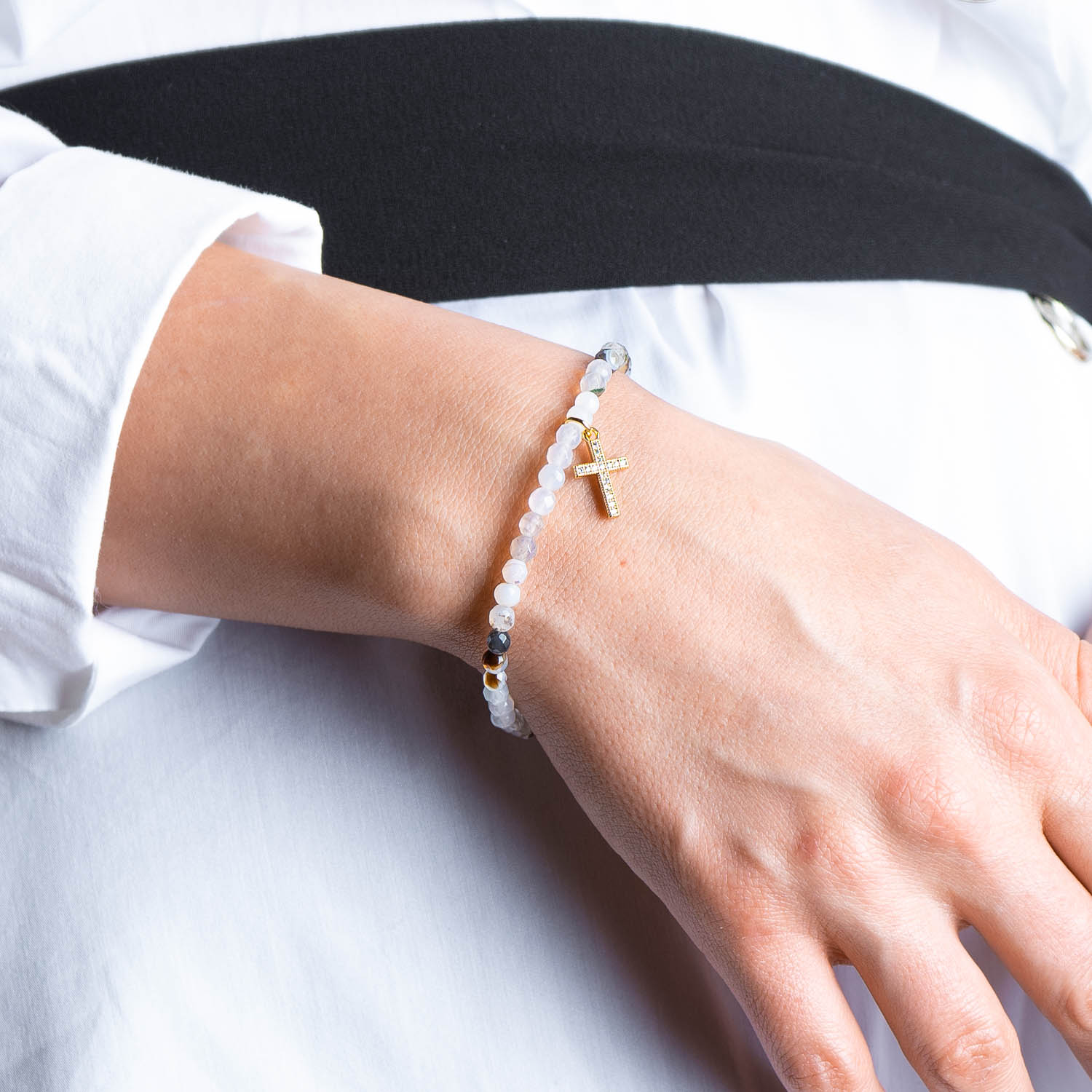 Omamnú čistotu bielej rozbíjajú záblesky čiernej. Rovnako ako stopy zaklesnuté do čerstvo napadaného snehu. Jemný náramok Lavaliere Harmónia je doplnený o krížik posiaty kamienkami. Ten je symbolom ochrany a pomôže upevniť vašej mysli cestu k životu v harmónii.