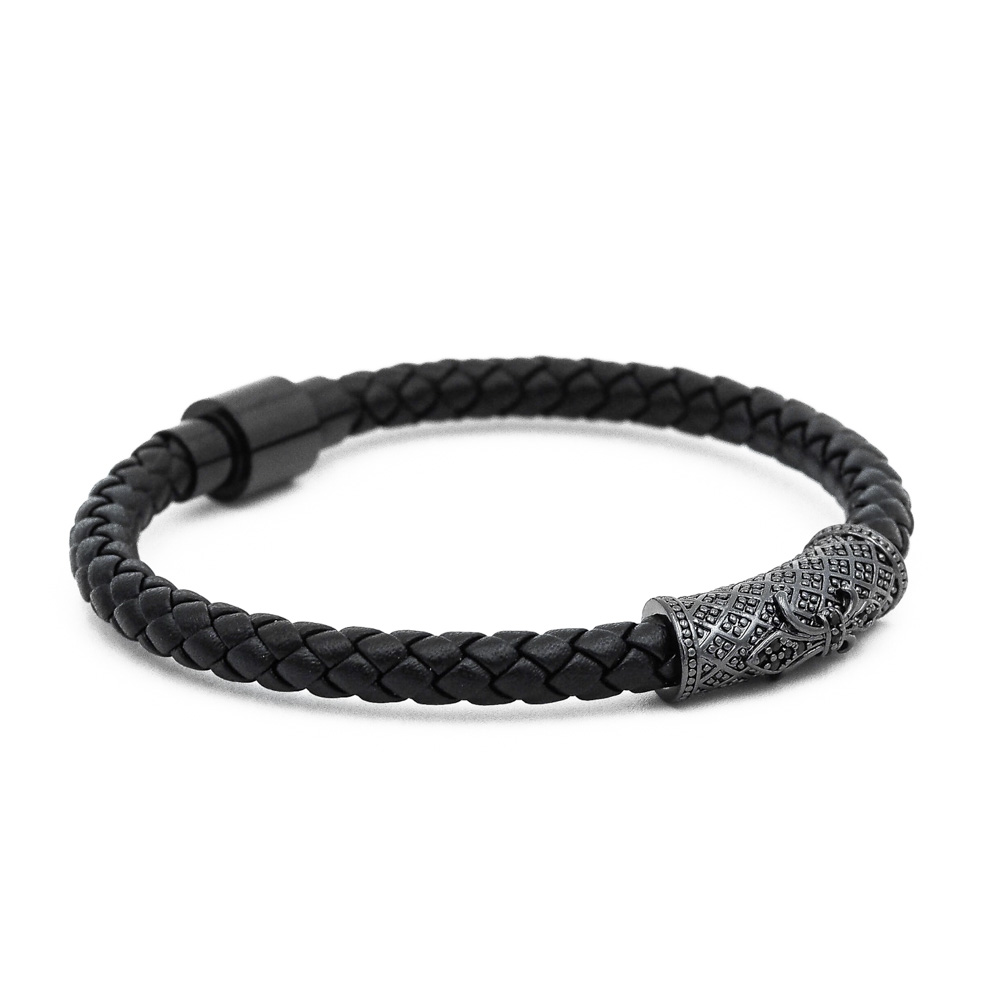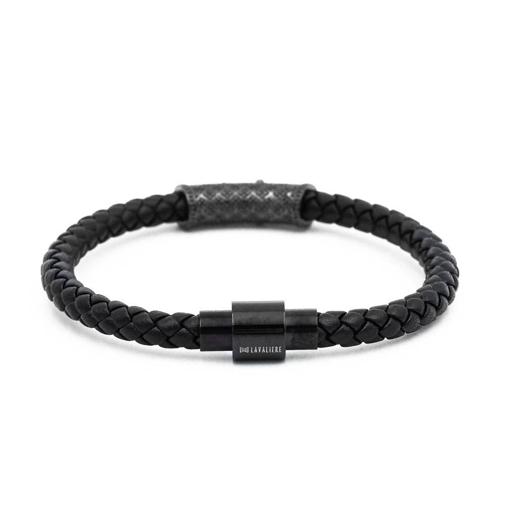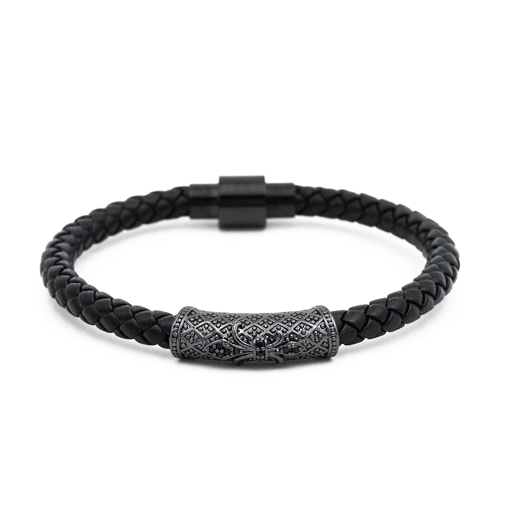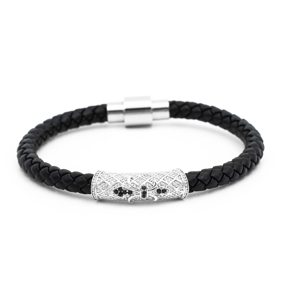 Precízne spletená čierna hovädzia koža do jednoduchého náramku, ktorý doplňuje výrazný mosadzný prvok s temnými kamienkami. Luxus náramku Lavaliere Jednoduchosť a prepych bieleho zlata dodáva povrchová úprava mosadzného doplnku 18k zlatom. Jednoduchý, ale napriek tomu výrazný doplnok pre zápästie každého muža.